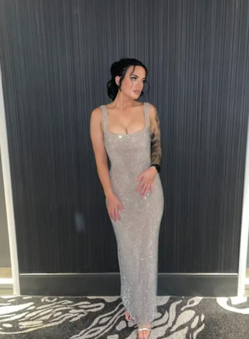La robe longue Maeva - Or est le mélange parfait d'élégance et de charme. Ses ornements en strass scintillants et son design semi-transparent créent un look envoûtant, tandis que l'encolure carrée et le dos échancré ajoutent une touche de sophistication. Le tissu extensible luxueux épouse vos courbes, offrant à la fois confort et style. Idéale pour créer des souvenirs inoubliables, cette robe est votre pièce phare ultime pour toute occasion spéciale.