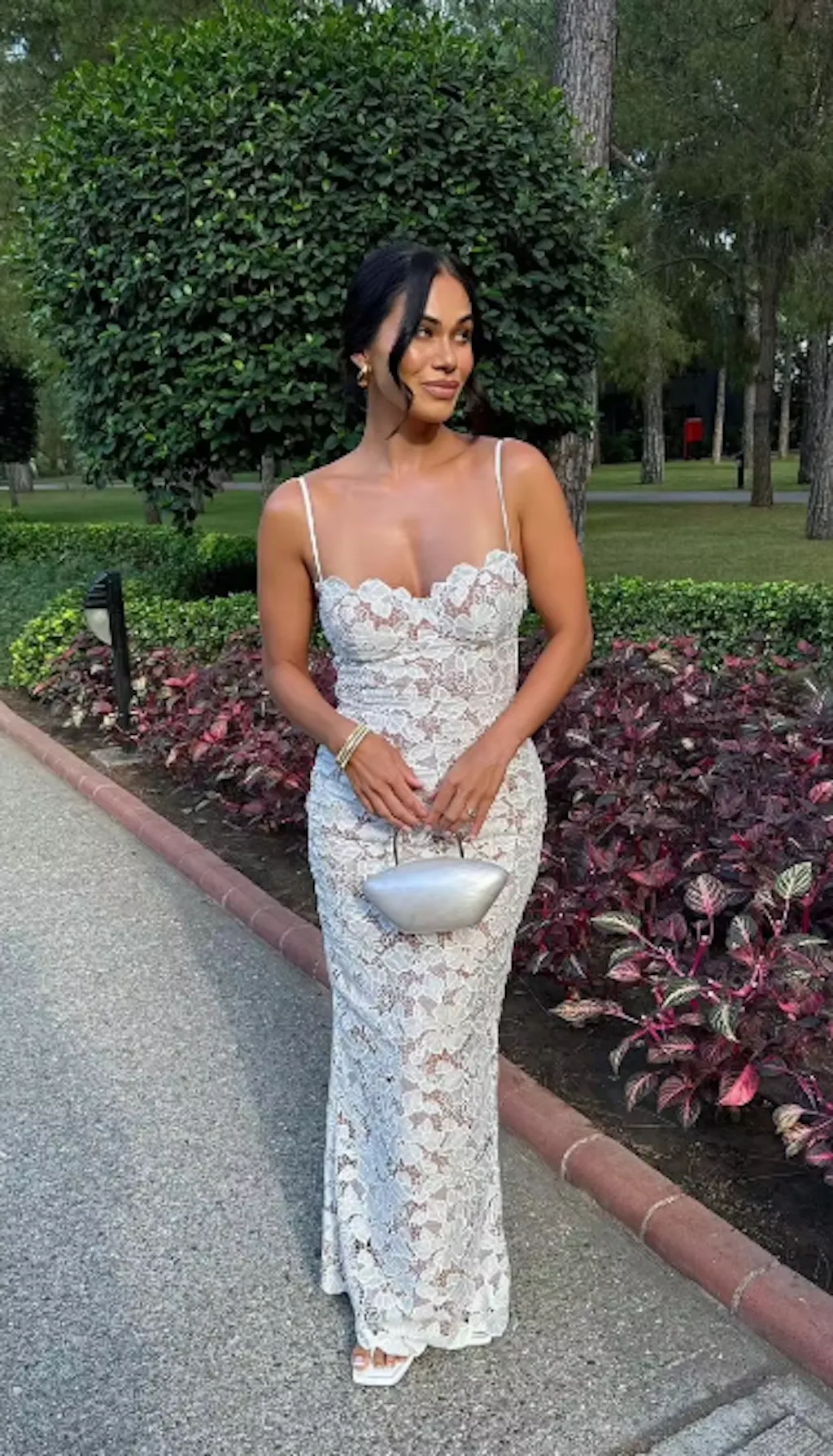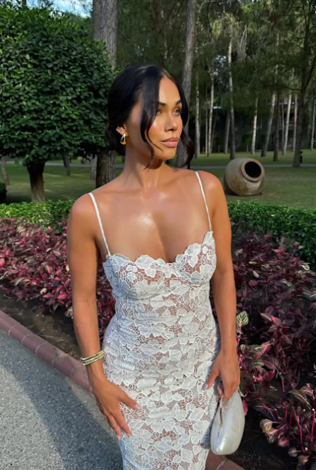 The dainty pin thin straps frame the pretty neckline and we just adore the scalloped trims for the prettiest finish. 'Tracy' zips to the side for easy on.